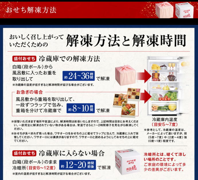 解凍方法: 冷凍おせちを食べる際には、以下の手順で解凍してください。