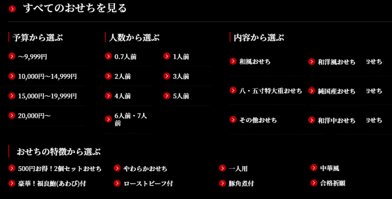 また、板前魂では、公式サイトを開くと、下記のように「人数から選ぶ」「ご予算から選ぶ」「内容から選ぶ」というメニュー表があって、おせちをわかりやすく選ぶことができるように工夫されています。