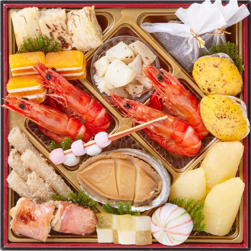<15品>帆立明太和え … 40g/甘栗甘露煮 … 1個/紅芋金団 … 70g/金箔黒豆 … 40g/千種焼き … 3切/くるみ甘露 … 10g/田作り … 5g/鰆昆布〆 … 3本/ロブスター … 1尾/海老錦手まり … 2個/クリームチーズ酒粕漬け … 3切/サーモントラウト幽庵焼き … 2切/金柑蜜煮 … 1個/紅白手毬しぼり … 1個/紅梅かんざし … 1本