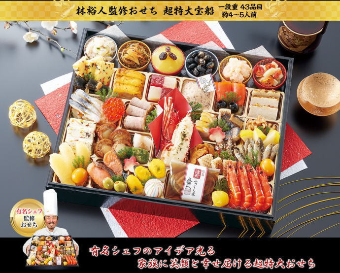 林裕人シェフはその料理の巧みな技術と奇抜なアイディアで知られ、テレビ番組でも視聴者を魅了しています。そのシェフが監修したおせち料理は、見た目も美しく、味わいも格別です。特大の宝船型のお重に盛り付けられた「超特大宝船」は、一段一段に贅沢な味が広がり、家族や友人との新春の食卓を華やかに彩ります。