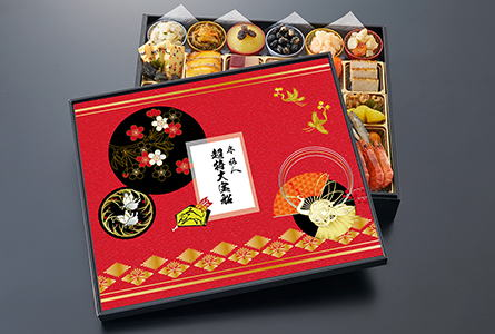 従来の通常の重箱の約3.2倍の特注サイズのお重を用いた大迫力のおせちは、見た目のインパクトに負けず、中身も充実の豪華な仕上がりになっています。