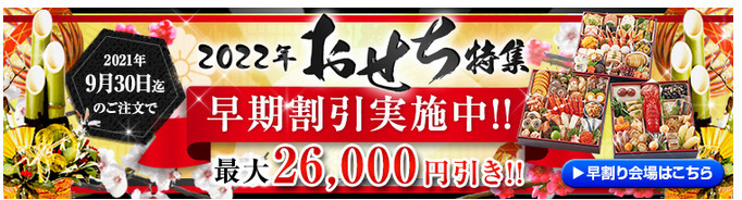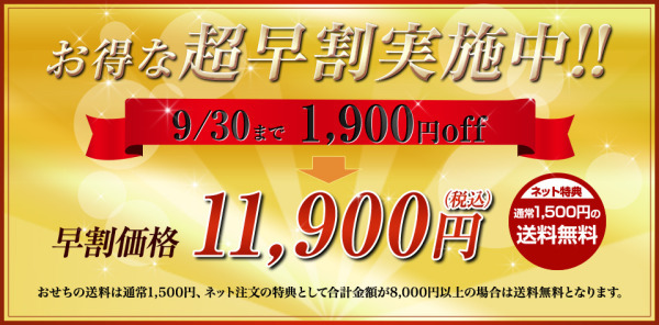 この早割りを利用して予約をしておけば、割引という特典のほかに、品切れの心配もありませんので、安心してお正月を迎えることができますね。